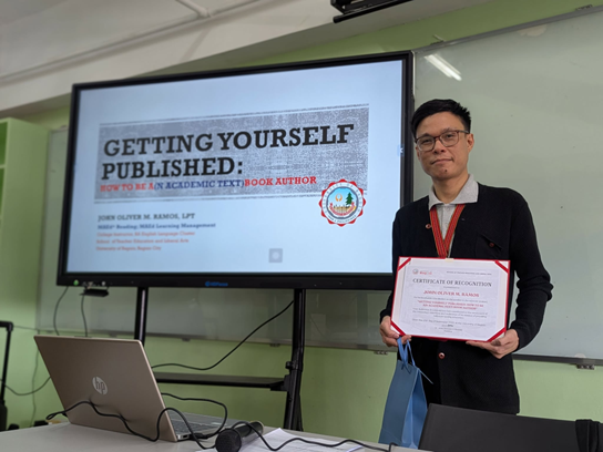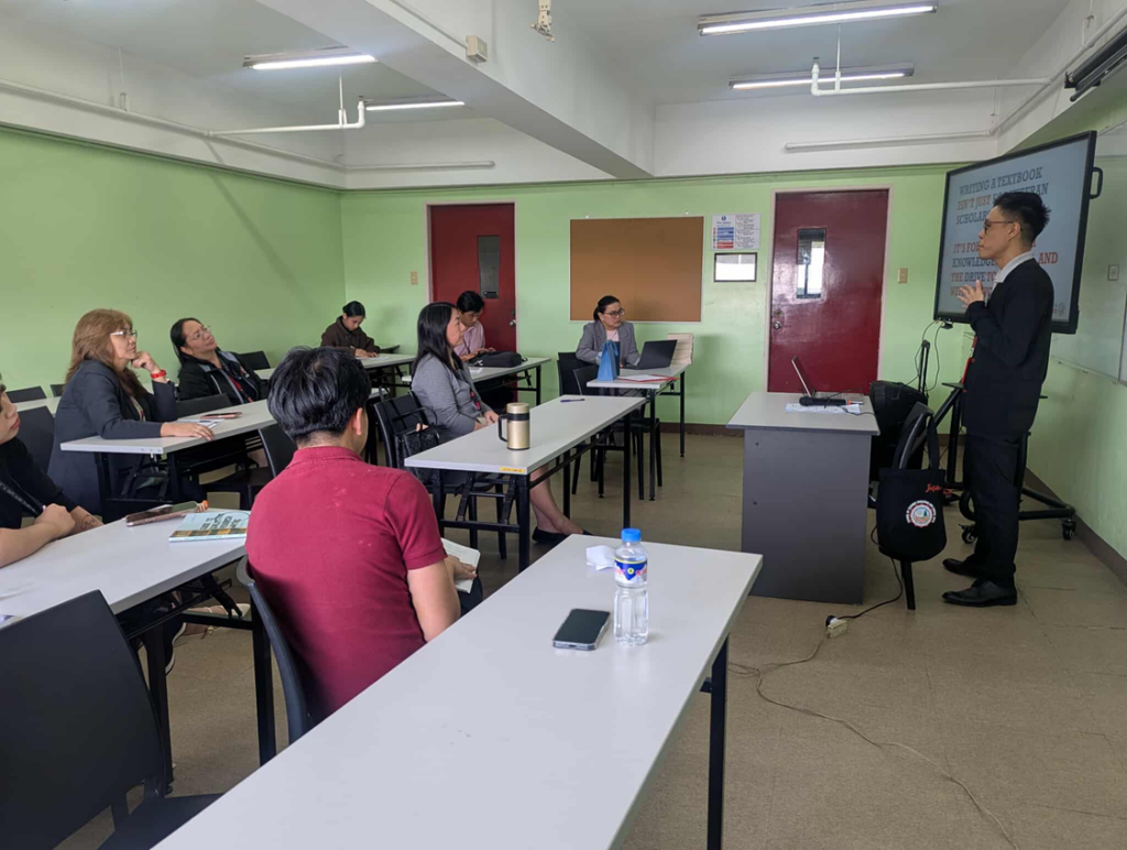 The BA English Language Program of the University of Baguio opened its T.E.A.C.H. (Teaching Enhancement Advancement for Competent and Holistic Educators) Seminar Series with Getting Yourself Published: How to Be a(n Academic Text)book Author on September 25, 2025, at the Centennial Building, Room H508. Starting promptly at 1:30 PM, the session began with Dr. Michelle P. Ranges, Program Chair of BA English Language, introducing the speaker, Mr. John Oliver M. Ramos, STELA faculty instructor, MATDEV1 teacher, and published textbook author. With full attendance from the BA English faculty, the seminar successfully met the target of the BA English Language program’s faculty development program for this session.